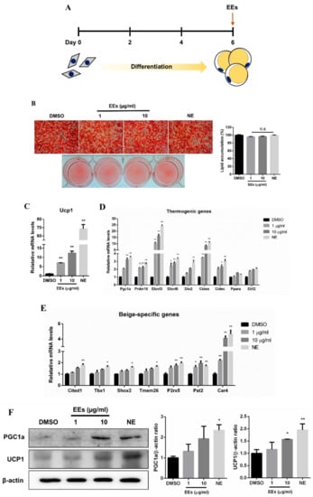 Effects of EEs on the browning process in differentiated mIPA. (A,B) Fully differentiated mIPA were treated with EEs for 6 h and stained with ORO dye. (C–E) Expression levels of Ucp1, thermogenic genes, and beige-specific genes in EEs-treated cells were investigated by real-time qPCR and compared with controls (DMSO and NE groups). (F) Protein levels of UCP1 and PGC1a were analyzed by Western blotting. Results are shown as mean ± SEM (n = 3). *, p < 0.05; **, p < 0.01 compared to the untreated control group.