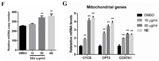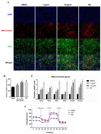 To demonstrate whether enhanced thermogenesis in differentiated mIPA was caused by EEs treatment, mitochondrial activity was investigated. The mitochondrial content was increased in EEs-treated adipocytes compared to the untreated control group, as evidenced by fluorescence-stained mitochondria and immunofluorescence-stained mitochondrial-localized UCP1 (Figure 3A). Additionally, it was found that 10 μg/mL EEs up-regulated the expression of mitochondrial-related genes, including Cycs, Tfam, Nrf1, Cox7a1 (~3-fold), Cox8b (~3.3-fold) (p < 0.01), and Nrf2 and mtDNA copy number (p < 0.05) (Figure 3B,C). These results showed that EEs promoted fluorescence-stained mitochondria contents, mtDNA copy number and mitochondrial gene expression in differentiated mIPA.