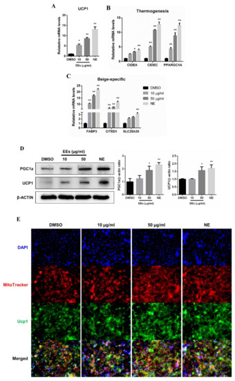 Effects of EEs on mitochondrial biogenesis and activity of differentiated mIPA. (A) Fully differentiated mIPA were stained with MitoTracker Red and anti-Ucp1 antibody, respectively. Images were analyzed with a fluorescence microscope. (B,C) Relative mtDNA copy number and expression levels of mitochondrial genes were analyzed by real-time qPCR. (D) Oxygen consumption rate of differentiated mIPA stimulated with 10 µg/mL of EEs and NE. Results are shown as mean ± SEM (n = 3). *, p < 0.05; **, p < 0.01 compared to the untreated control group.