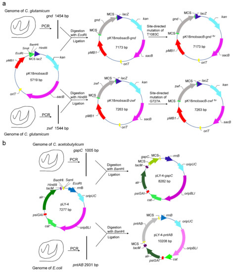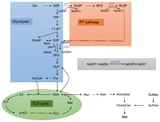 - Xu, J.Z.; Yang, H.K.; Zhang, W.G. NADPH metabolism: A survey of its theoretical characteristics and manipulation strategies in amino acid biosynthesis. Crit. Rev. Biotechnol. 2018, 38, 1061–1076. [Google Scholar] [CrossRef] [PubMed]