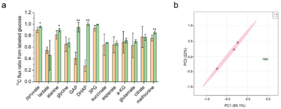 2.9. 13C-Metabolic Flux Ratio of Metabolites from the Labeled Glucose