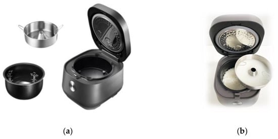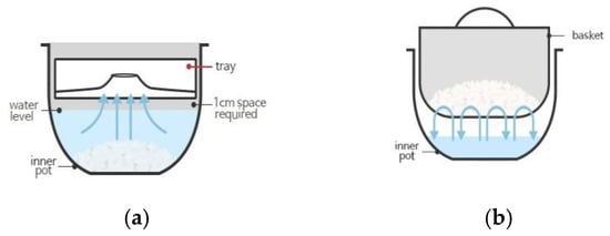 Schematic design of siphon and wash-down carb-reducing rice cooker types. (a) Siphon-type carb-reducing rice cooker characterized by a tray in the inner pot. As the inside of the rice cooker heats up rapidly, pressure difference occurs in the inner pot. (b) Wash-down type carb-reducing rice cooker displays a basket and an inner pot that is deeper than the basket.