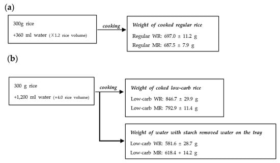 Weight change diagram of rice and water before and after cooking: (a) regular rice; (b) low-carb rice. Low-carb rice samples were cooked with water/rice (W/R) ratios of 4.0 (1200 mL) without immersion in water in low-carb rice mode of the rice cooker for 35–45 min. General rice samples were cooked with W/R ratios of 1.2 (300 mL) after soaking the rice in water for 30 min in the ‘general rice mode’ of the rice cooker for 45–50 min. White rice (WR): 300 g polished rice; mixed-grain rice (MR): 210 g polished rice + 90 g mixed-grain rice).