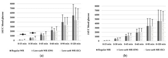 Figure 4 shows the iAUC blood glucose of the test foods. Blood glucose iAUC after low-carb WR (EW) intake was significantly lower at the time points of 0–15 and 0–30 min compared to regular WR (0–15 min: p < 0.05; 0–30 min: p < 0.05). However, no significant difference could be observed in iAUC blood glucose between regular MR and low-carb MR.