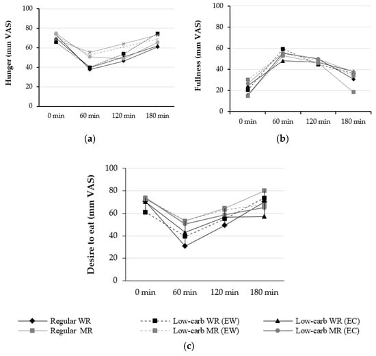 Change in hunger, fullness, and desire to eat using a visual analog scale. EC, equivalent carbohydrate as regular rice; EW, equivalent weight as regular rice; WR, white rice; VAS, visual analog scale; MR, mixture of mixed grains to WR (WR/MR ratio is 7:3). Data were not significantly different. (a) Hunger; (b) Feeling of fullness; (c) Desire to eat.