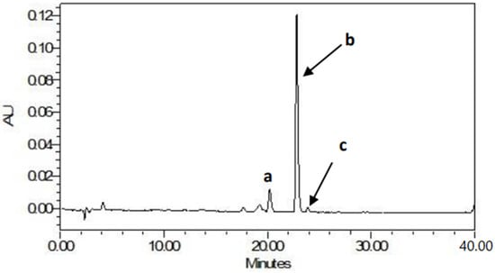 HPLC chromatogram showing beta-carotene peaks in the extract of orange-fleshed sweet potato composite bread at 450 nm. Peak identification: (a) 13-cis β-carotene, (b) all-trans ß-carotene (c) 9-cis β-carotene.