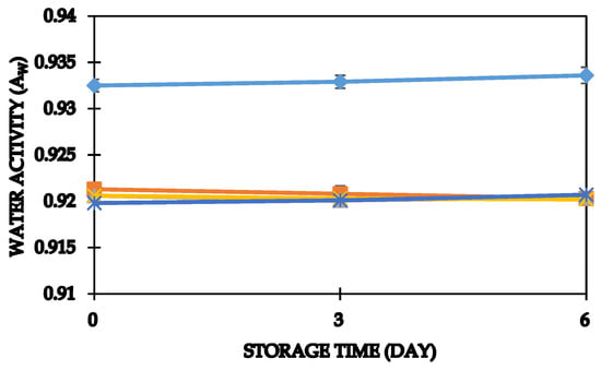 Water activity (aw) was determined by a water activity meter (Aqua Lab Series 4TE, Decagon Devices, Inc., NE Hopkins Ct., Pullman, WA, USA) [31]. The instrument was calibrated with 0.5 mol/kg, aw = 0.984 potassium chloride standard solution at 25 °C. Water activity was determined after 0, 3, and 6 days of storage. The analysis was performed in triplicate.