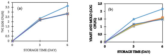 The microbial quality profiles of bread in the study are shown in Figure 3a,b. Microbial counts in sweet potato purée bread were significantly lower (p < 0.05) in comparison to the control sample. TVC, yeast, and molds were absent in freshly baked bread. This shows that the bread was of good quality and safe for consumption. Total counts ranged between 2.17–2.35 log10 cfu/g and 2.82–3.64 log10 cfu/g after 3 and 6 days of storage, respectively.