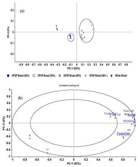 (a) Score plots, and (b) correlation loading plots from the principal component analysis of wheat−OFSP purée bread quality attributes.