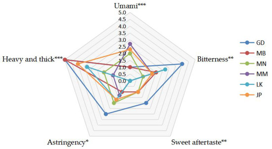 Radar map of the taste characteristics of Oolong tea from different producing areas. The taste quantitative evaluation data shown in the radar map are the mean values of Oolong tea samples in the same producing area. GD, Guangdong, China; MB, Northern Fujian, China; MN, Southern Fujian, China; MM, Myanmar; LK, Sri Lanka; JP, Japan. * p < 0.05, ** p < 0.01, *** p < 0.001.