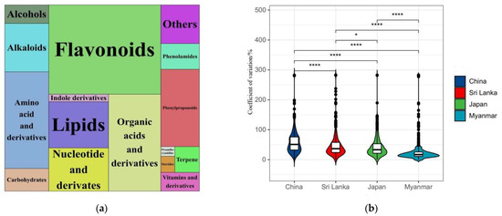 Statistical analysis of nonvolatile components of Oolong tea from different producing areas. (a) Tree view of nonvolatile components classification. The larger the area and text of the component category in the figure is, the larger the number and proportion of the component category is. Each color represents a class of compounds. (b) Violin chart of coefficient of variation of components of Oolong tea in four countries. * p < 0.05, **** p < 0.001.