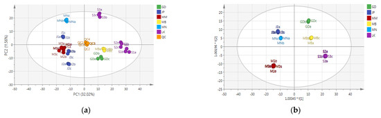 PCA can form new characteristic variables by a linear combination of variables according to a certain weight. Because there are no external human factors, the PCA model can reflect the original state of the data [24]. PCA was performed with all detected nonvolatile compounds as variables, and the results are shown in Figure 3a. Six QC samples were gathered in the middle of the PCA score plot, and the three repetitions of each sample could be effectively aggregated, indicating good repeatability and reliable data. In the PCA score chart, the distribution of Oolong tea samples from the three producing areas in China was the most dispersed, followed by Sri Lanka and Japan, and Myanmar was clustered together. These results indicated that the difference in nonvolatile compounds in the Oolong tea samples from the three producing areas in China was the largest, followed by Sri Lanka and Japan, while the difference between Myanmar’s Oolong tea was the smallest. This conclusion was exactly the same as that of the coefficient of variation (Figure 2b). The samples of Oolong tea from Japan and Myanmar were relatively clustered on the PCA score plot, indicating that the content of nonvolatile compounds of Oolong tea from the two countries was relatively similar.