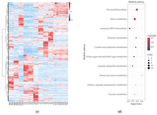 Since there was no complete metabolomics database for tea plants, Arabidopsis thaliana was taken as the corresponding species for KEGG metabolic pathway analysis. The screened differential compounds were mainly enriched in 67 metabolic pathways (Table S4), of which the 10 metabolic pathways with the highest enrichment were respectively: flavonoid biosynthesis, purine metabolism, aminoacyl-tRNA biosynthesis, galactose metabolism, cysteine and methionine metabolism, amino sugar and nucleotide sugar metabolism, arginine, and proline metabolism, starch, and sucrose metabolism, alanine, aspartate and glutamate metabolism, and tyrosine metabolism (Figure 3d). Flavonoid biosynthesis mainly included the metabolism of flavonoids, flavonoid glycosides, catechins, and anthocyanins [27]. The products of purine metabolism also participated in the biosynthesis of alkaloids [28]. Aminoacyl-tRNA biosynthesis, cysteine and methionine metabolism, amino sugar and nucleotide sugar metabolism, arginine and proline metabolism, alanine, aspartate, and glutamate metabolism, and tyrosine metabolism belonged to the synthesis and degradation of amino acids [29]. Galactose metabolism and starch and sucrose metabolism were mainly the synthesis and transformation of saccharides [30]. Therefore, the difference in the content of nonvolatile compounds in Oolong tea from different producing areas mainly stemmed from the metabolism of flavonoids, amino acids, saccharides, and alkaloids in Oolong tea. These four substances are also the main contributing components of the Oolong tea flavor [3].