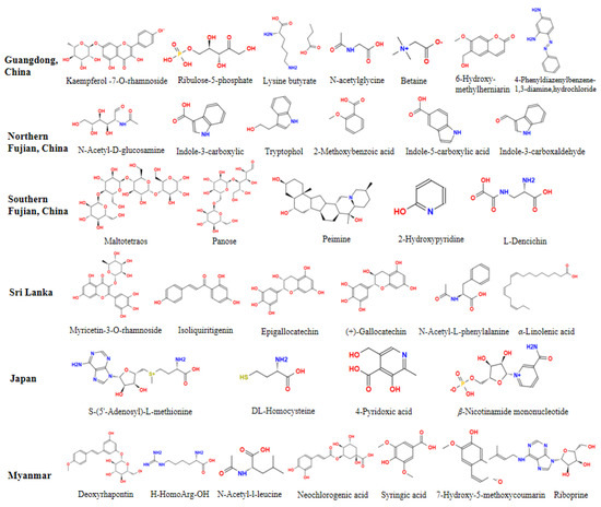To sum up, 35 characteristic compounds were screened from Oolong tea from different producing areas (Figure 5), including seven in Guangdong, six in Northern Fujian, five in Southern Fujian, six in Sri Lanka, four in Japan, and seven in Myanmar. These selected characteristic compounds were the compounds specifically accumulated by Oolong tea in a certain producing area, which could be applied to the traceability identification of Oolong tea from this producing area and other producing areas. The reasons for the specific accumulation of characteristic compounds of Oolong tea from these producing areas need to be further studied.