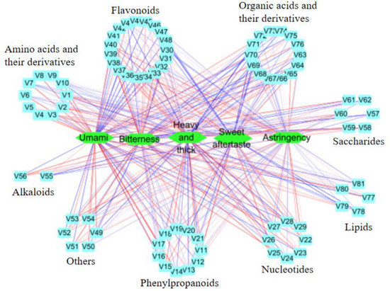 Correlation network between differential nonvolatile compounds and taste attributes in Oolong tea from different producing areas. V1–V81 indicate 81 differential compounds (compound names are shown in Table S5). The red line indicates a positive correlation, and the blue line indicates a negative correlation, and the darker the color, the stronger the correlation.
