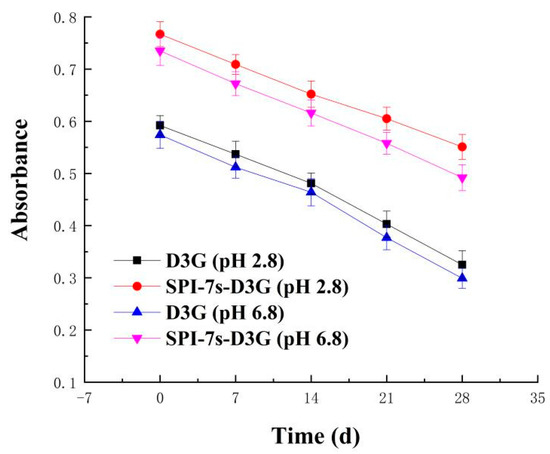 Figure 1 and Figure 2 show the absorbance and retention rate of SPI-7s-D3G and D3G when they were treated with sunlight (28 d, 20 ± 2 °C) in PBS (pH 2.8/pH 6.8). The absorbance and retention rate of SPI-7s-D3G were increased to 41.02%/39.23% and 16.94%/14.85%, respectively. A similar report by He et al. [29] indicates the retention rate of WPI-C3G was increased to 9.2%, when subjected to photo illumination treatment at pH 3.6 (10 d). The retention rate of SPI-7s-D3G and WPI-C3G were improved, which indicated that protein could enhance the stability of anthocyanins under light treatments. As shown in the results, the retention rate of SPI-7s-D3G had a higher value in the acidic system recorded compared to the neutral system.