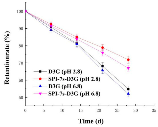 The stability test of SPI-7s-D3G by sunlight treatments was designed according to previous studies [29] with slight modifications. The sunlight illumination of SPI-7s-D3G (pH 2.8/pH 6.8) was studied under sunlight (samples were placed on the indoor windowsill and the daily insolation time was not less than 6 h) at room temperature (20 ± 2 °C) on 0, 7, 14, 21, and 28 days. The untreated D3G was used as control, and the retention rate for sunlight stability analysis is shown in Equation (2).