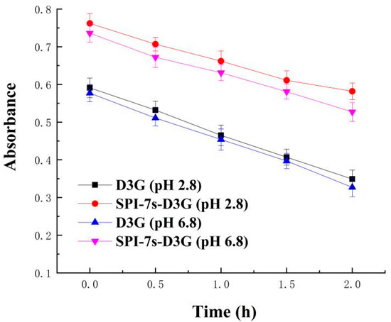 Figure 3 and Figure 4 show the absorbance and retention rate of D3G when they were subjected to heat treatment (2 h) in the absence and presence of SPI-7s in PBS (pH 2.8/pH 6.8). The absorbance and retention rate of SPI-7s-D3G were increased to 40.34%/37.95% and 17.33%/14.93%, respectively. These results indicate that SPI-7s improved the stability of D3G more efficiently in acidic condition than neutral condition. A similar study showed that the retention rate of C3G at pH 3.5 increased from 55.00% to 67.50% when compounded with rice glutelin fibrils [32]. It might be the higher stability of flavium cation form of anthocyanins in low pH environment [33]. The retention rate of the purple-fleshed sweet potato anthocyanin extracts and soy protein complex was increased by 16.2%, when it was heated by 100 °C for 30 min at pH 3.0 [34]. He et al. [29] also found that the retention rate of WPI-C3G was increased by 9.4% after heating by 80 °C for 8 h at pH 3.6. The results indicate that the interaction between protein and anthocyanins could protect the stability of anthocyanins during heat treatment.