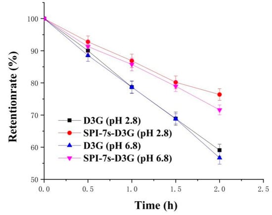 The thermal stability test was carried out according to previous studies [18] with slight modifications. The thermal stability of SPI-7s-D3G (pH 2.8/pH 6.8) was evaluated in the water bath at 100 °C at 0.5, 1, 1.5, and 4 h. The untreated D3G was used as control, and the retention rate for thermal stability analysis is shown in Equation (2).