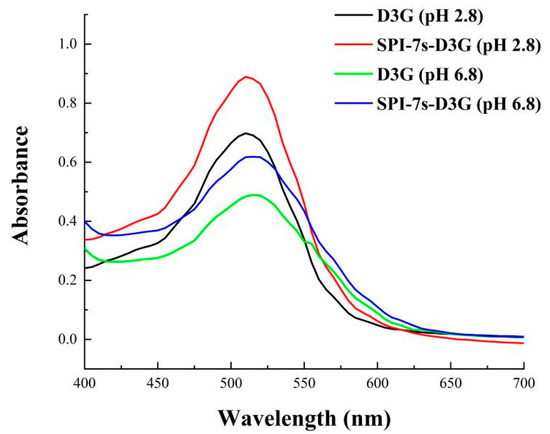 The UV-Vis spectra of SPI-7s-D3G and D3G (pH 2.8/pH 6.8) were recorded in Figure 6. The results showed that when D3G combined with SPI-7s, the intensity of D3G changed and the absorption peaks increased by 4/2 nm. This indicated that SPI-7s and D3G produced intermolecular or intramolecular co-pigmentation, which produced a redshift effect on the maximum absorption wavelength of D3G in a visible range [27]. Meanwhile, SPI-7s-D3G had high stability in the acidic system, because the absorption peak intensity of pH 2.8 was higher than pH 6.8.