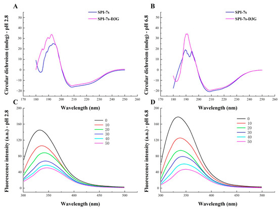 Circular dichroism spectra and Fluorescence spectra of stable system. Circular dichroism spectra of pH 2.8 (A), Circular dichroism spectra of pH 6.8 (B), Fluorescence spectra of pH 2.8 (C), Fluorescence spectra of pH 6.8 (D). SPI-7s-D3G: The complex of soybean protein isolate-7s and delphinidin-3-O-glucoside; 0–50: D3G concentration (μmol).