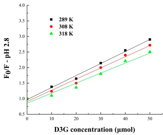 Stern–Volmer plots for SPI-7s-D3G (pH 2.8). SPI-7s-D3G: The complex of soybean protein isolate-7s and delphinidin-3-O-glucoside.