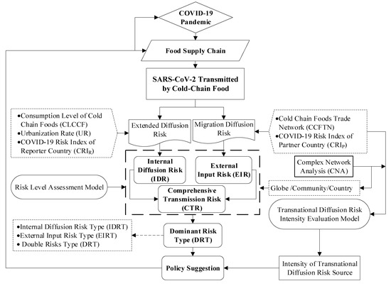 Considering the quantity of food consumption in cold chain and the flow of international trade network, this study builds on the following research framework (Figure 1), including analysis of CCFTN characteristics—, evaluation of COVID-19 diffusion source intensity—, Assessment of COVID-19 transmission risk level—, classification of dominant risk types, and—Policy recommendations”. The study starts with two perspectives, i.e., internal diffusion and migration diffusion. First, the internal diffusion risk (IDR) was evaluated based on the UR, CCF consumption level [35], and domestic CRI. Second, the CNA method was used to analyze the characteristics and community structure pattern of global CCFTN; this method has been widely applied to study trade characteristics and virus spread [36,37]. The global migration diffusion source intensity was then analyzed, based on the out-strength degree and CRI level. Third, the external input risk (EIR) was evaluated based on CCF imports, the number of partners, and the CRI of partner countries. Based on the IDR and EIR, the comprehensive risk assessment and dominant risk type identification were determined using different dimensions: globe, community, and country. Finally, proposes adaptive strategies to prevent the risk of COVID-19 transmission through CCF and maintain the security of the global food supply chain.