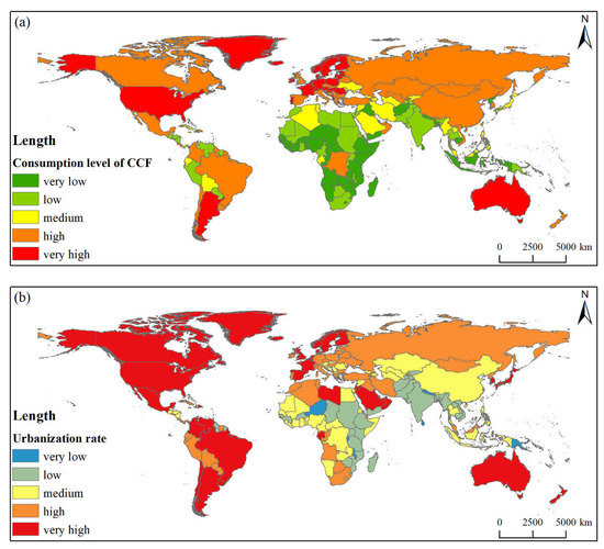 From the perspective of CCF consumption patterns, Figure 2a shows that 31 countries belong to very high consumption levels, such as European countries, the USA, Argentina, Australia and some European countries. A total of 51 countries are classified as having a high consumption level, mainly distributed in Americas and Asia. Moreover, a total of 116 countries are classified as having a medium consumption level and below, mainly in Africa, West Asia, Southeast Asia, and Southeast Asia. From the perspective of the urbanization level and distribution pattern, the countries in Europe and America are classified as very high and high; the countries in Southeast Asia, West and Central Africa, and the Southeast Asian islands are generally classified as having a medium level; and the land countries in South Asia and Southeast Asia are generally classified as having a low and very low level (Figure 2b).
