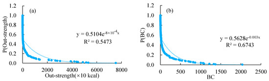 The CCFTN has 198 nodes and 11,924 lines, with an annual trade quantity of 80,249.05 × 1010 kcal. The probability distribution fitting results illustrating different attributes of the nodes in the cold chain transportation network show that the out-strength distribution of nodes in CCFTN has typical scale-free distribution characteristics with strong heterogeneity (Figure 3a). Export core nodes play a leading role in the structure and normal operation of the trade network.