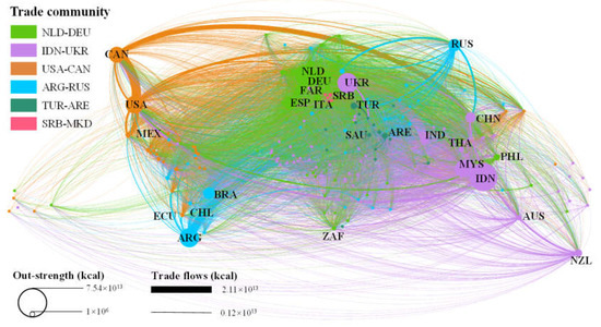 The results of community structure analysis show that the CCFTN includes 6 trade communities, dominated by big exporting countries (Figure 4). The total quantity of intra-community trade is 48,477.35 × 1010 kcal, accounting for 60.37% of the trade across the total network (Table 4). Community division results and internal energy flow characteristics are as follows (Figures S1 and S2). (1) The quantity of trade for the NLD-DEU community accounts for 28.43% of the total CCFTN. The Netherlands, Germany, Spain, Belgium, and France are the main exporting countries; CCF mainly flows to Germany, the Netherlands, Italy, France, Belgium, and other European countries, and also radiate to parts of Africa. (2) The quantity of trade for the IND-UKR community accounts for 15.07% of the total CCFTN. CCF mainly flows from Indonesia, Ukraine, Malaysia, and New Zealand to India, China, and Malaysia, radiating to Southeast Asia, Australia, and Africa. (3) The quantity of trade for the USA-CAN community accounts for 8.54% of the total CCFTN. The USA and Canada are the main exporting countries. CCF mainly flows into each other between the USA and Mexico as well as Canada. South Korea, Japan, and other American countries are important CCF export destinations. (4) The quantity of trade for the RUS-ARG community accounts for 6.33% of the total CCFTN. Russia, Argentina, Brazil, and Belarus are the main CCF outflow sources. CCF flows mainly to Russia, Algeria, Egypt, Iran, Norway, Venezuela, and some South American, Central Asia, and West Asia countries. (5) The quantity of trade for the TUR-ARE community accounts for 1.85% of the total CCFTN. CCF mainly flows from the United Arab Emirates, Turkey, and Saudi Arabia to Iraq, Yemen, the United Arab Emirates, and other Western Asian countries. (6) The quantity of trade for the SRB-MKD community accounts for 0.15% of the total CCFTN, with generally singular flows of CCF from Serbia to the other four countries.