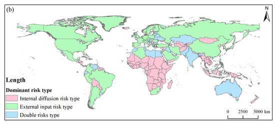 The identification of dominant risk types revealed that 61.62% of countries are dominated by IDR, with 22.73% of countries are experiencing primarily external input risks. Also, some a few countries face double risks, and accounting for 15.66% of the total country count. From a spatial distribution perspective (Figure 7b), the IDR types are mainly distributed in Africa, Southeast Asia, Central Asia. In contrast, North America, South America, and most parts of Europe are dominated by external risk. A few countries in Eastern Europe, North Africa, and South Asia are dominated by double risks.