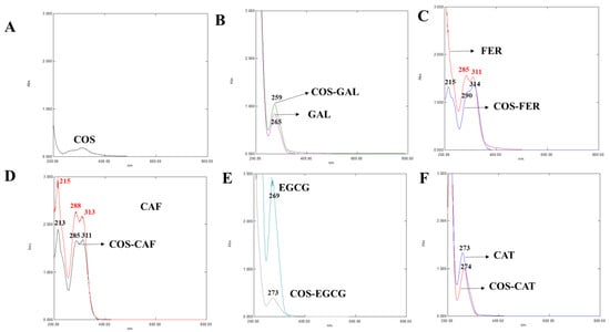 UV spectra of COS (A), GAL and COS-GAL (B), FER and COS-FER (C), CAF and COS-CAF (D), EGCG and COS-EGCG (E), and CAT and COS-CAT (F): COS, chitooligosaccharide; GAL, gallic acid; FER, ferulic acid; CAF, caffeic acid; EGCG, epigallocatechin gallate; CAT, catechin. The black and red numbers on the peaks indicate their wavelength.