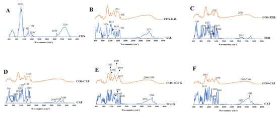 FTIR spectra of COS (A), GAL and COS-GAL (B), FER and COS-FER (C), CAF and COS-CAF (D), EGCG and COS-EGCG (E), and CAT and COS-CAT (F): COS, chitooligosaccharide; GAL, gallic acid; FER, ferulic acid; CAF, caffeic acid; EGCG, epigallocatechin gallate; CAT, catechin.