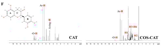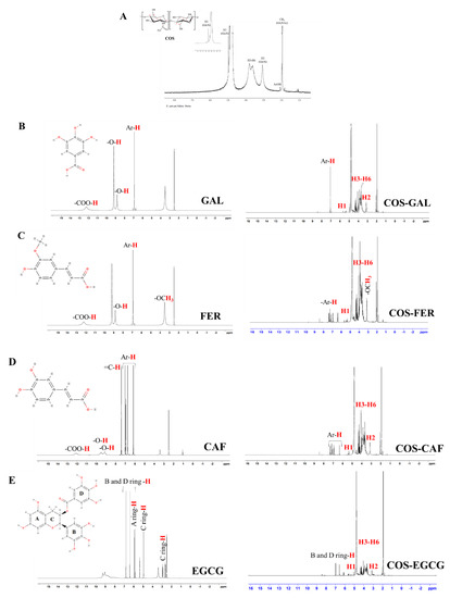 1H-NMR spectra of COS (A), GAL and COS-GAL (B), FER and COS-FER (C), CAF and COS-CAF (D), EGCG and COS€CG (E), and CAT and COS-CAT (F): COS, chitooligosaccharide; GAL, gallic acid; FER, ferulic acid; CAF, caffeic acid; EGCG, epigallocatechin gallate; CAT, catechin.