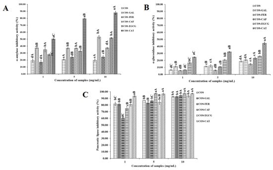 α-amylase (A), α-glucosidase (B), and pancreatic lipase (C) inhibitory activities of COS, COS-GAL, COS-FER, COS-CAF, COS-EGCG, and COS-CAT. Different uppercase superscripts within the same sample indicate significant differences (p < 0.05); different lowercase superscripts within the same concentration indicate significant differences (p < 0.05): COS, chitooligosaccharide; GAL, gallic acid; FER, ferulic acid; CAF, caffeic acid; EGCG, epigallocatechin gallate; CAT, catechin.