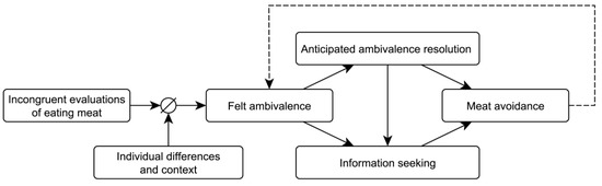 In the absence of effective mechanisms to regain a stable non-ambivalent attitude and avert experiences of ambivalence from recurring, one way to nonetheless reduce the aversive recurrence of felt ambivalence could be avoiding the ambivalent object, i.e., avoidance of meat. According to pervasive models of ambivalence [25,68], avoiding the elicitors of felt ambivalence could be a coping strategy that facilitates the regulation of ambivalence. In line with this assertion, research on choice conflict showed that people will avoid decisions in conflicted choice contexts more often than in unconflicted contexts [69,70,71]. A similar avoidance mechanism might arise from ambivalence. Specifically, the anticipation of ambivalence reduction [72,73] could drive the avoidance of stimuli and situations that elicit felt ambivalence, with the aim to alleviate ambivalence-induced negative affect [68]. The avoidance of meat consumption may thus be perceived as an effective means to reduce the aversive recurrence of felt ambivalence.
