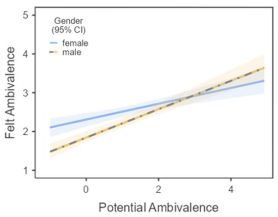 Next, multiple regression analyses investigated moderators of the association of potential ambivalence (i.e., the coexistence of strong but incongruent evaluations about meat consumption) with felt ambivalence in Process [89]. As predicted and in line with previous research (see [25]), the association of potential ambivalence with felt ambivalence was only moderate (see Table 2). We therefore investigated the roles of gender and social context in moderation analyses that indicated interaction effects of the two variables with potential ambivalence on felt ambivalence. The association of potential ambivalence with felt ambivalence was more pronounced in males, β = 0.49, than females, β = 0.27, ps < 0.001, with a significant interaction of gender and potential ambivalence, β = −0.22, p = 0.006 (see Figure 2). There were significant gender differences in felt ambivalence at low levels of potential ambivalence, β = 0.51, p < 0.001, and mean potential ambivalence, β = 0.23, p = 0.003, but not at high potential ambivalence, β = −0.04, p = 0.72 (see Figure 3). Likewise, social context and potential ambivalence interacted, β = −0.17, p = 0.013, such that the association of potential ambivalence with felt ambivalence was more pronounced at low SC, β = 0.41, and mean social context, β = 0.36, than at high social context, β = 0.25, ps < 0.001. Social context significantly predicted felt ambivalence only at low levels of potential ambivalence, β = 0.53, p < 0.001, and mean potential ambivalence, β = 0.32, p < 0.001, but not at high potential ambivalence, β = 0.10, p = 0.18. There were no significant interaction effects on felt ambivalence by social context and gender or by social context, gender, and potential ambivalence, βs < 0.05, ps > 0.58.