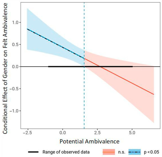 Johnson–Neyman plot of the association of gender with felt ambivalence at values of potential ambivalence about meat consumption. The dotted vertical line indicates the border of the significance region at a value of potential ambivalence of 1.55, with 63.65% of participants scoring below that value.