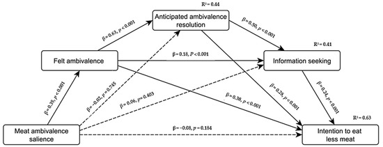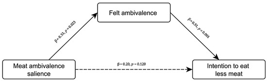 Mediation model of the experimental effect of meat ambivalence salience on intention to eat less meat through felt ambivalence in Study 2. Effect sizes are displayed as standardized direct effects (i.e., isolated from the other effects).