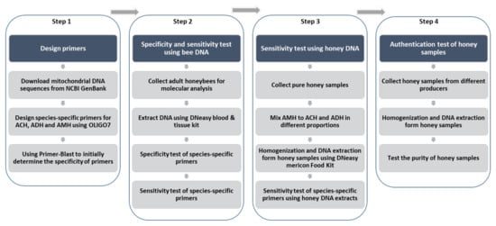 In this study, 3 species-specific primer sets were designed to test the traceability of the entomological origin of honey. The specificity and sensitivity of the primers were tested first with the DNA extracts from honeybees with different geographical origins. Then, the DNA extracts from artificially mixed honey samples were used to evaluate the applicability of using designed primer sets in honey authentication. Subsequently, the developed method was used to check the entomological origin of honey provided by honey hunters and beekeepers (Figure 1).