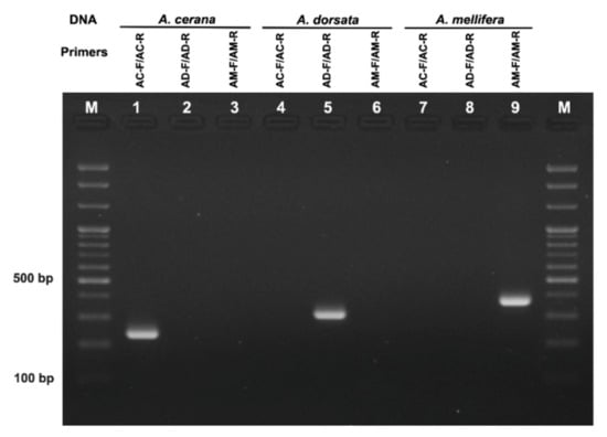 The following supporting information can be downloaded at: https://www.mdpi.com/article/10.3390/foods11070928/s1, Table S1: The honey samples and their labels and localities used for analysis. Table S2: Mitochondrial sequences of honeybees (A. cerana, A. dorsata and A. mellifera) used to design species-specific primers. Figure S1: Preliminary specificity test of ACF/ACR (Suarez et al., 2018) using DNA extracts of honeybees [39,40,41,42,43,44,45,46,47,48,49,50,51,52,53,54,55,56,57].