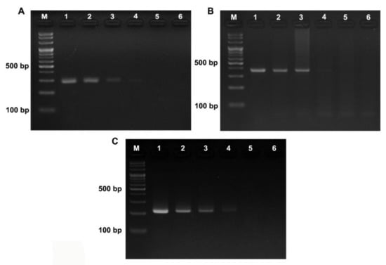 Sensitivity test of the designed species-specific primers using serially diluted DNA extract of A. dorsata (A), A. mellifera (B), and A. cerana (C). Lane M, DNA marker; Lane 1, 100 ng; lane 2, 10 ng; lane 3, 1 ng; lane 4, 0.1 ng; lane 5, 0.01 ng; lane 6, negative control.