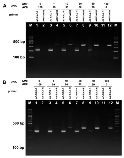 In other to test the ability to detect the target DNA among pure and adulterated honey samples, AMH was mixed with either ADH or ACH in different proportions. DNA was extracted from pure and mixed honey and used for the subsequent PCR analysis. Importantly, although the same amount of DNA (100 ng) from honey and bee samples was used for PCR, we were not able to detect the specific band from the first round of PCR with DNA from honey, unlike with DNA from bees (Figure 2 and Figure 3). This is likely due to actual amount of bee DNA being lower in DNA extracted from honey, as the honey sample contains biological tissues of other organisms (e.g., plant, microorganism, and other insect tissues). Thus, we performed another round of PCR by using 5 μL of PCR product as a template for analyzing the honey samples. In the second round of PCR, AC-F/AC-R and AD-F/AD-R primer sets produced a single band at the expected size with DNA from 100% ACD (Figure 4A, lane 1) and 100% ADH (Figure 4B, lane 1), respectively. On the contrary, the AM-F/AM-R primer set failed to amplify the band from the DNA extracted from 100% ACH (Figure 4A, lane 2) or 100% ADH (Figure 4B, lane 2). Neither AC-F/AC-R nor AD-F/AD-R primer sets amplified the specific bands from DNA extracted from 100% AMH (Figure 4A,B, lane 11).
