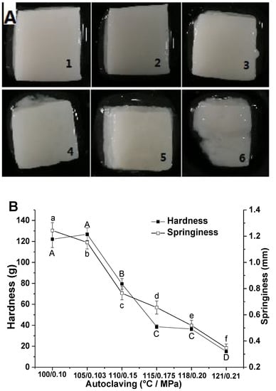 Appearance and texture of CMP gels were shown in Figure 1A,B. When temperature/pressure of autoclaving was no more than 105 °C/0.103 MPa, surfaces of the gels were smooth and compact, gel blocks appeared good uniformity, integrity, and elasticity. However, when temperature/pressure was above 105 °C/0.103 MPa, surfaces of the gels appeared defective and inhomogeneous, and became weaker and weaker along with the intensification of autoclaving. When temperature/pressure reached up to 121 °C/0.21 MPa, the gel collapsed, and gel characteristics basically disappeared.