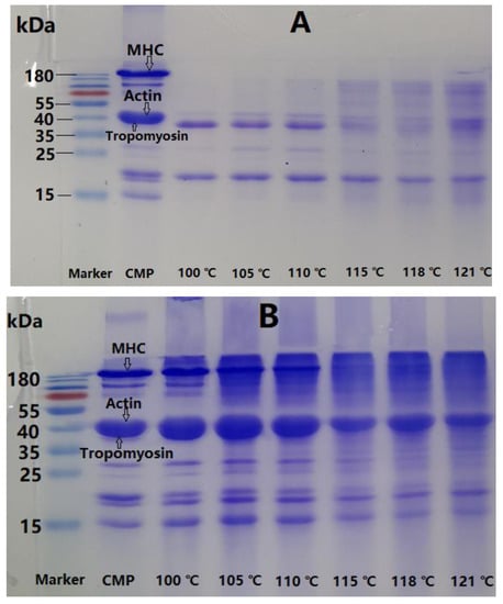 The change in proteins was investigated by using SDS-PAGE to analyze the inclusion solution (Figure 2A) and matrix (Figure 2B) in CMP gel. The results in Figure 2A show that centrifugal solution from CMP gel obtained by the various autoclaving was mainly composed of tropomyosin and MLC. However, some new bands clearly appeared when temperature/pressure of the autoclaving reached 115 °C/0.175 MPa, and meanwhile tropomyosin faded away; however, MLC had no obvious change, indicating that tropomyosin tended to degrade through autoclaving. Moreover, some proteins in the gel matrixes could be severely degraded and transferred from gel matrix to the solution, and so resulted in some new bands.