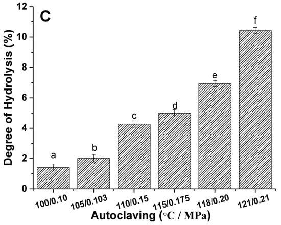 The effect of autoclaving on DH of CMP is presented in Figure 2C. DH of CMP increased gradually from 1.41% to 10.43% when autoclaving increased from 100 °C/0.10 MPa to 121 °C/0.21 MPa. High-temperature processing results in degradation of animal muscle proteins. Beef proteins degraded during high temperature processing, and DH was correlated positively with temperature and time. At the initial stage, beef myofibril protein formed a gel, but this was followed by the obvious degradation of MHC, which eventually degraded into peptides and free amino acids [22]. Similar phenomena have also been reported in fish, chicken, and pork [23,24,25]. Therefore, it was speculated that the degradation of CMP (mainly MHC) resulted in texture deterioration of crayfish meat due to gel weakening.