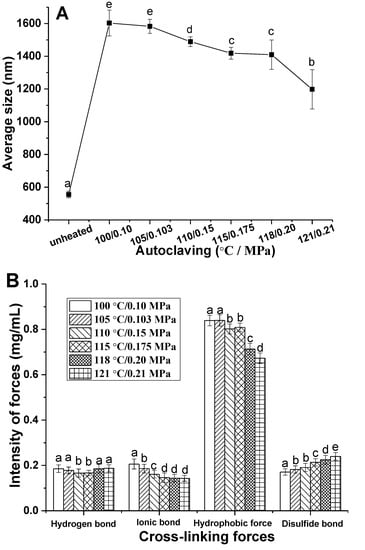 (A) Average size of aggregates in CMP solutions after various autoclaving; (B) Cross-linking forces in various CMP gel. Bars indicate the standard deviations of the means (n = 3), and different lowercase letters (a–e) on the top of the columns represent significant difference in the same cross-linking force between CMP gels obtained at various autoclaving according to Duncan tests (p < 0.05).