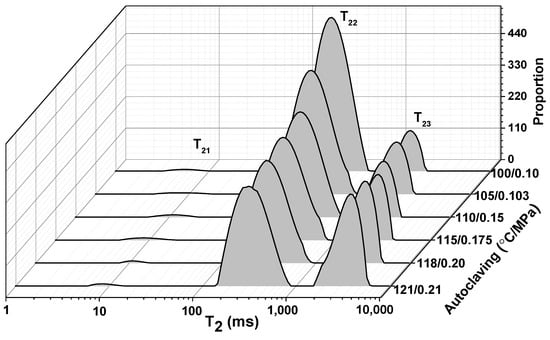 LF-NMR is an accurate and efficient method to determine the state and distribution of water molecules according to their mobility. T2 relaxation times indicate bound degree of water molecule. The peaks T21, T22, and T23 were shown in the T2 spectrum of the gel samples by various autoclaving (Figure 4), The peak T21 represented the tightly bound water with macromolecules, the peak T22 was attributed to moderately bound water entrapped within enclosed spaces in gel network, and the peak T23 corresponded to the free water that was bound loosely and fluidly in the gel network [29,30].