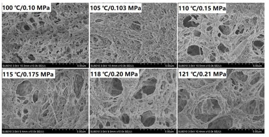 Research on the gel microstructure could be helpful to understand its properties [31]. Microstructures of CMP gels after various autoclaving are presented in Figure 5. A compact gel network was formed by autoclaving below 105 °C/0.103 MPa. Along with the intensification of autoclaving, the network of CMP gels became looser and looser, and pores became larger and larger, suggested that cross-linking degree of gel gradually reduced. Denatured myosin could be served as active gel building blocks as it is highly reactive [32], while degradation of MHC accounted for the alteration in the gel microstructure at above 105 °C. Therefore, a negative correlation of autoclaving on the microstructure of CMP gel can observed, especially at above 105 °C, which was consistent with the results above.