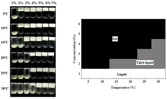 Temperature of Gelation Phase Diagram for different concentrations of stigmasterol organogels at different temperatures: gel (i.e., freestanding gel), thick liquid (liquid was clearly thickened, but freestanding gel was not observed), and liquid (i.e., no gelation observed).
